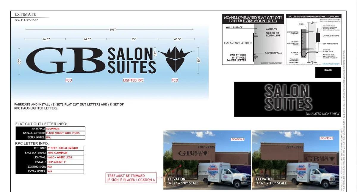 Work Order for Addisigns. Created vector artwork for GB Salon Suite’s new illuminated building signage.