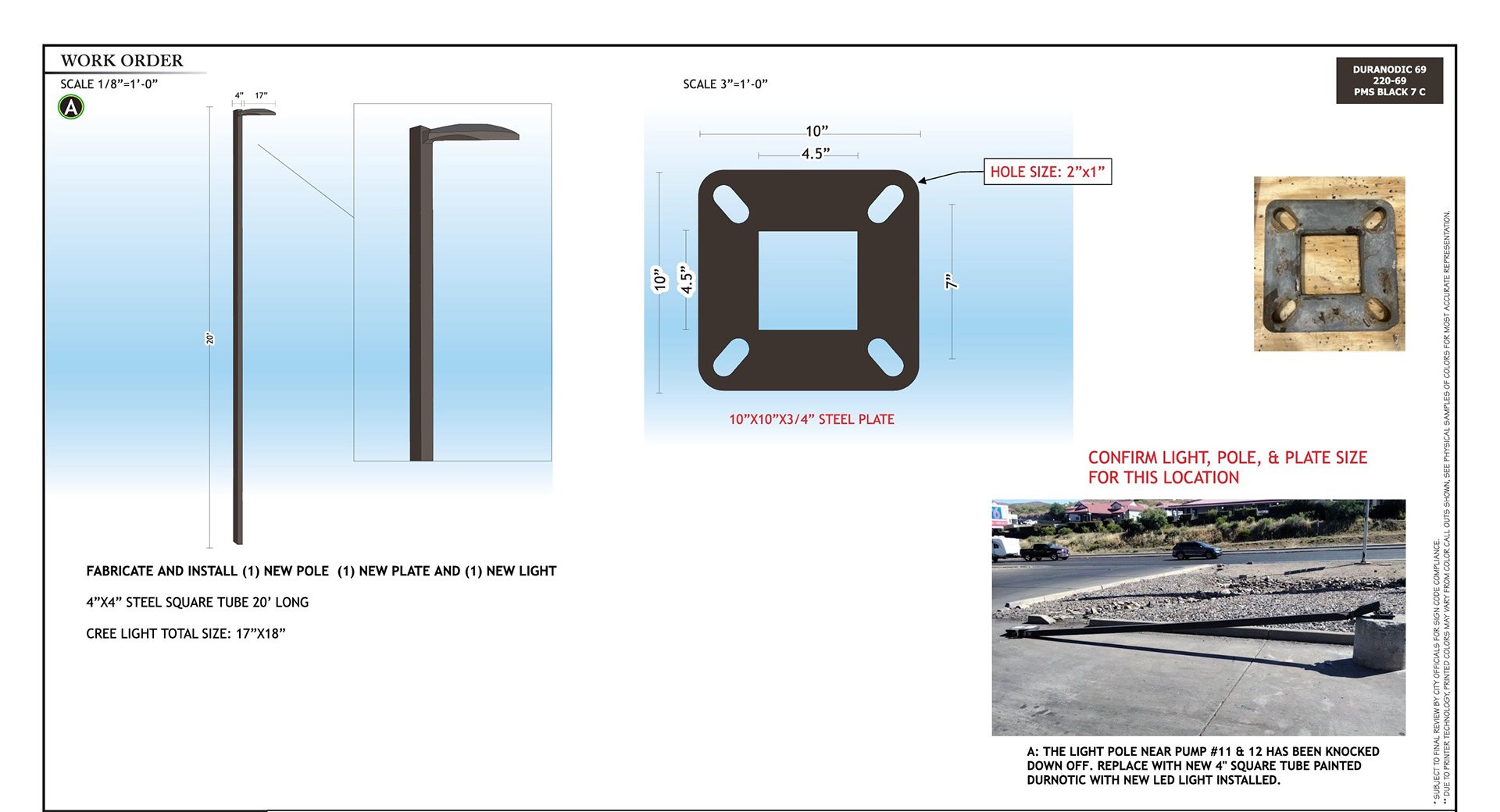 Work Order for Addisigns. Created vector artwork for the construction of a new light pole to replace one that was severely damaged.