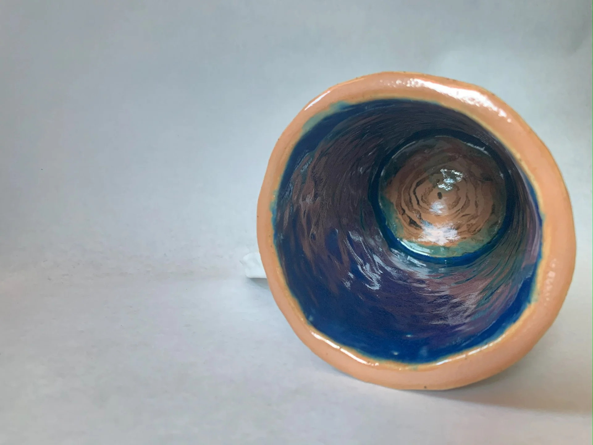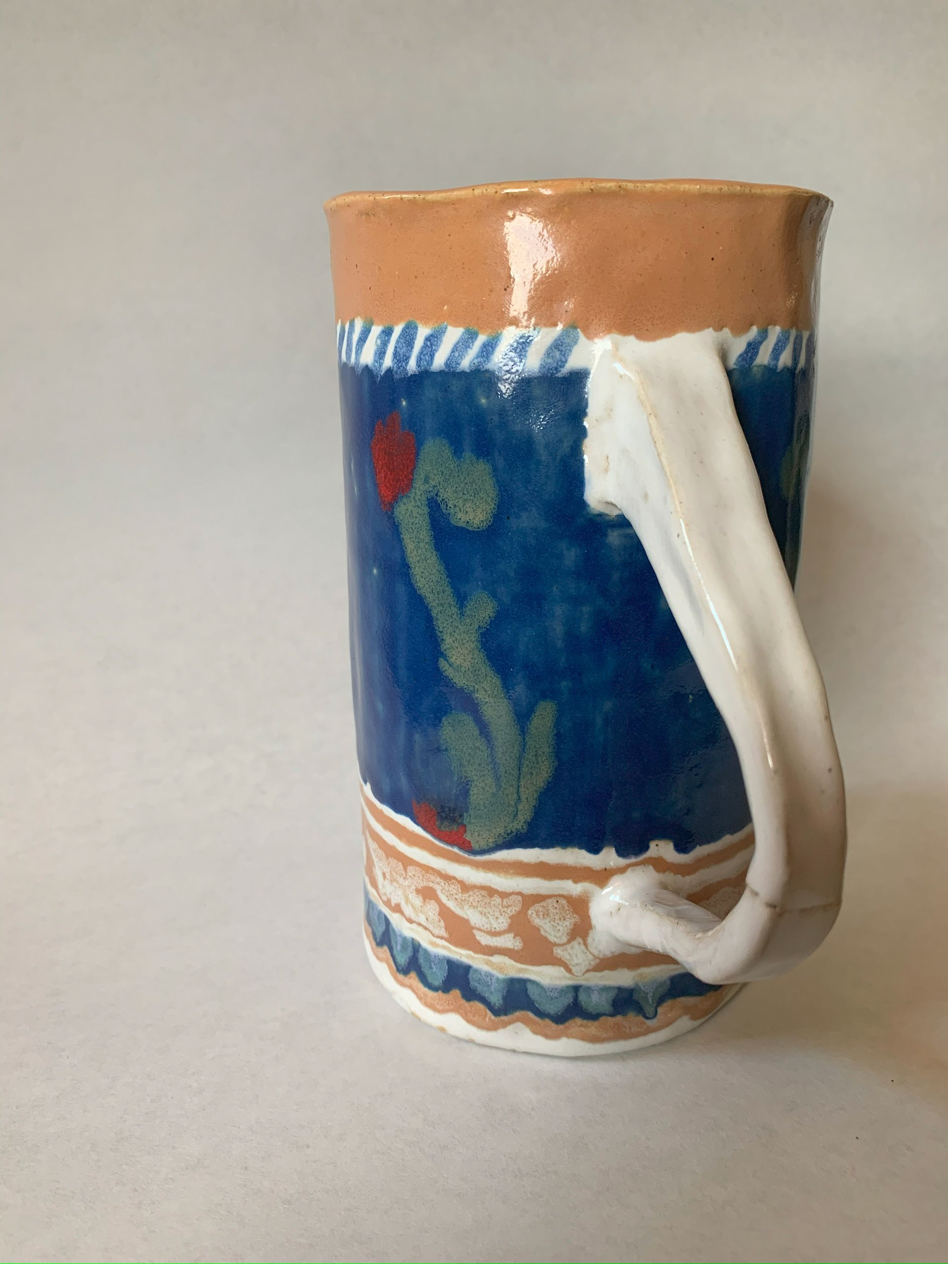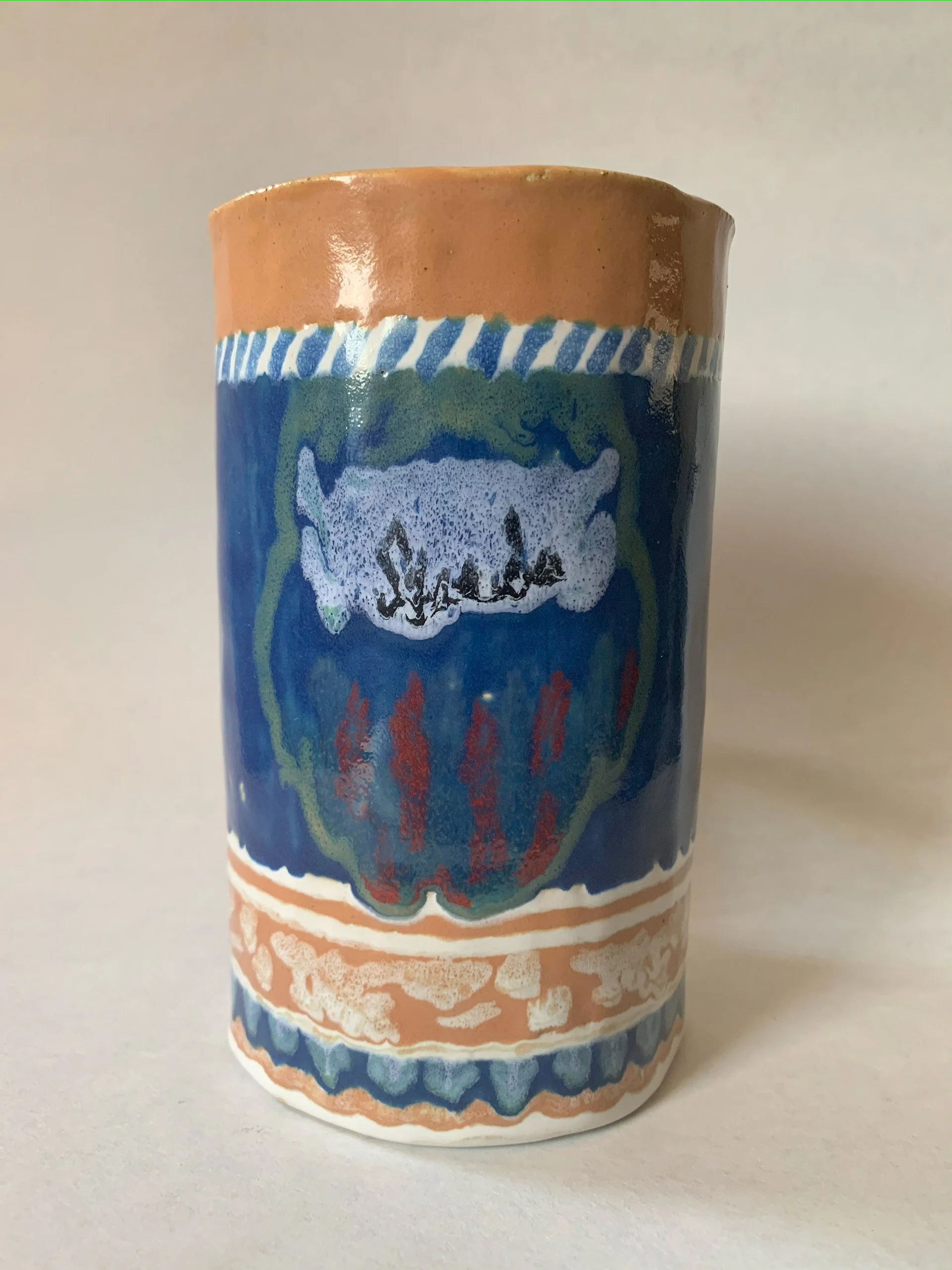 Stein Glazed Ceramic (”x”x”), 2021Hand-built ceramic stein. Glaze dripped quite a bit unfortunately, but some details remain.